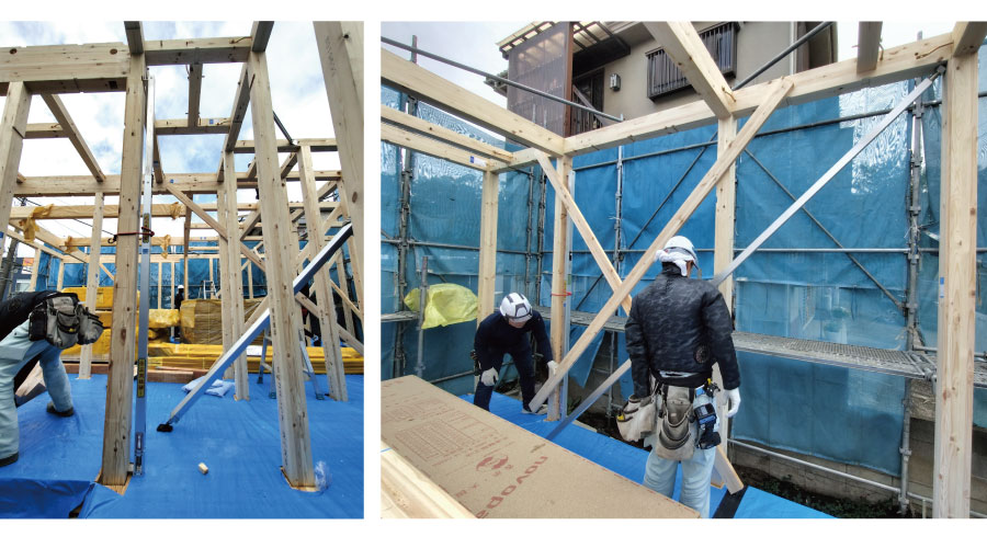 木材を持ち上げたり打ったりする大きな動きと、計測作業などの緻密な作業が同時進行で行われていく現場は片時も落ち着く様子がありません。